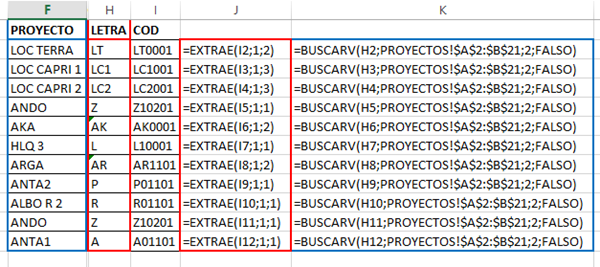 Tengo la primera tabla en donde está la lista de proyectos y la letra que le corresponde a cada uno, en la col 2 se encuentra la letra que le corresponde al proyecto la cual obtengo extrayendo letras del código (col 4), en la col 1 se encuentra el nombre del proyecto el cuál se asigna dependiendo la letra, esta se obtiene con la fórmula en la col 5.