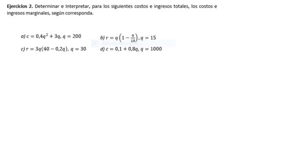 MatemáticasCiencias económicasCiencias empresariales victorri el 1 ago. 18 Calcular costo marginal en matemáticas Favor ayuda para resolver los siguientes ejercicios Seguir Siguiendo Dejar de seguir 1 Respuesta Respuesta 0 0 Anónimo Solo debes calcular las derivadas y evaluarla en el punto solicitado:$$\begin{align}&a) c'(q)=0.8q+3\\&c'(200)=0.8 \cdot 200+3=163\\&...\\&b) r'(q)=(1-\frac{q}{10}) + q(\frac{-1}{10})=1-\frac{q}{5}\\&r'(15)=1-\frac{15}{5}=-2\\&...\\&c) r'(q)=3 \bigg( (40-0.2q) - 0.2q)\bigg) = 120 - 1.4q\\&r'(30) = 120 - 1.4 \cdot 30 = 78\\&...\\&d) c'(q)=0.8\\&c'(1000)=0.8\end{align}$$Practica mucho ya que estas son derivadas de lo más sencillas!Salu2 el 1 ago. 18 - Anónimo ahora mismo Añadir comentario Usa los comentarios si quieres aportar algo a esta respuesta. No los utilices para preguntar algo nuevo. Cancelar Enviar