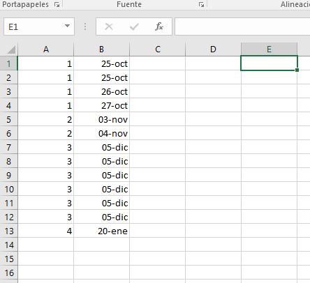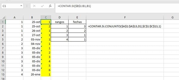 Bien, por ejemplo aquí, quiero que me sume en la columna C cuantas fechas hay distintas para cada rango de la columna A, es decir, que en el rango de unos me cuente 3 fechas distintas, para el rango de doses, 2, para el de treses, 1 y para el de 4, 1 también.
