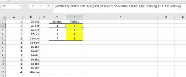 Necesito una función que me cuente de una columna de fechas las que son distintas para cada rango, os adjunto foto para que lo veáis claro.