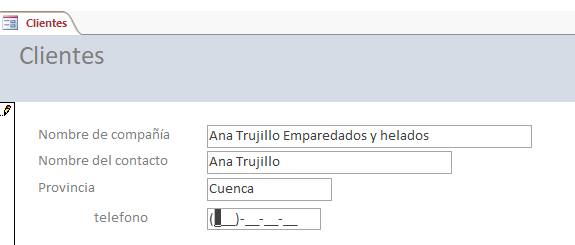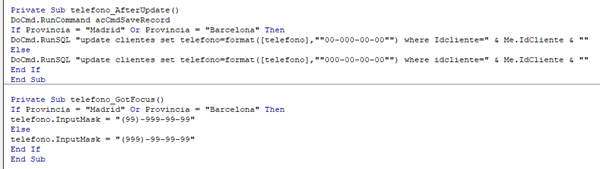Mirar tengo una base de datos en la que tengo varios campos para introducir el teléfono, como es teléfono móvil, teléfono particular y teléfono del trabajo, yo en la mascara de entrada pongo que se introduzca los teléfonos así (999) 99-99-99 y con ese formato es como se introduce también en el campo de la tabla, mi duda es que cuando introduzco un teléfono que es de madrid y barcelona el cual seria así (99) 999 99 99, pues que automáticamente me cambie la mascara de entrada con el formato de madrid y barcelona y así se introduzca en el campo de la tabla correspondiente. Estoy dándole vueltas para introducir esa diferenciación como código pero no caigo como hacerlo.