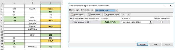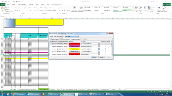 Tengo una hoja Excel con una regla de formato condicional para que se coloree una fila al cumplir una formula. El problema es que cuando inserto alguna fila Excel crea automáticamente la misma regla para esa fila insertada y divide la regla anterior en dos. Una de las reglas abarca desde el inicio hasta donde inserte la fila y otra a partir de la fila insertada. Con lo que al final tengo 3 reglas.