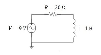 Un circuito RL tiene una fem de 9 V, una resistencia de 30 Ω, una inductancia de 1 H y no tiene corriente inicial, determinar la