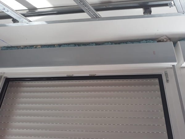 Esta foto es de una ventana de cerramiento de balcón, y me gustaría cuál es la manera más adecuada de rematar la parte superior, por dentro. El de las ventanas me dice que se le dé yeso, y el del yeso me dice que no va a agarrar y lo mejor es ponerle un tapajuntas.