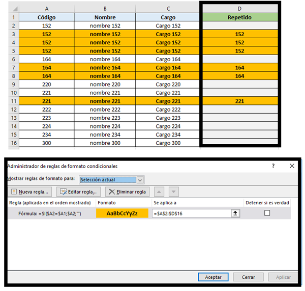 Todo expertos.. Necesito ayuda en la columna A esta los códigos del. Empleado en B está sus nombres y en C sus cargos. Mi. Problema que se repiten códigos de empleado que ideas me dan para cuando busque y encuentre valores repetidos los muestre en un formulario ya sea la cantidad de repetidos con una datos de las columnas ABC