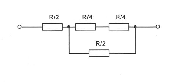 (a) Determine la resistencia equivalente de la red de resistencias de la figura. (b) ¿Cuál es la intensidad de corriente en cada resistencia si R=10 Ω y se aplica una diferencia de potencial de 80 V entre los puntos a y b?