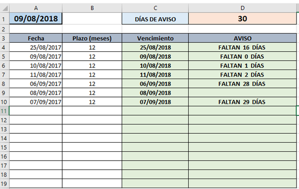 Trabajo en una empresa que hacemos contratos varios, y necesito que al poner la fecha me haga calcule el vencimiento del contrato para el próximo año y que me avise 30 días antes del vencimiento, ¿Es posible?.