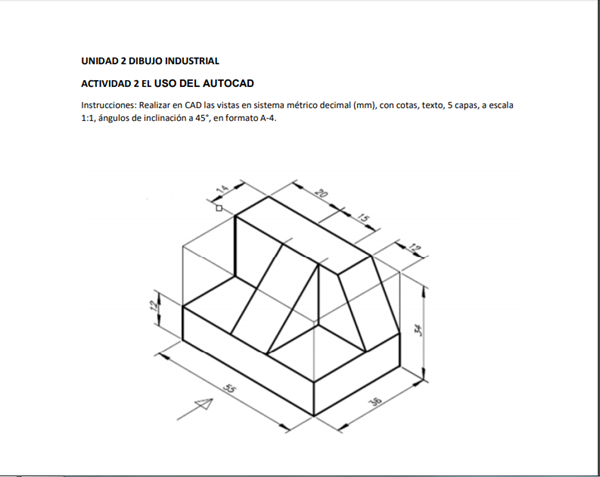 En esta actividad aplicarás en el campo de la industria los diferentes conceptos abordados en este apartado del segundo tema. El trabajo consiste en utilizar las aplicaciones tecnológicas específicamente el AutoCAD para identificar planos, a través de cortes y vistas, así como la constante práctica de los diversos comandos de la aplicación.