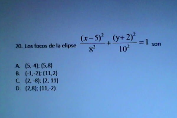 Yo hice los cálculos y me dio C= 6 y los focos : (5, 4) y (5, -8). Pero en las opciones de respuesta no esta el resultado que me dio a mi. Este es el ejercicio, gracias.