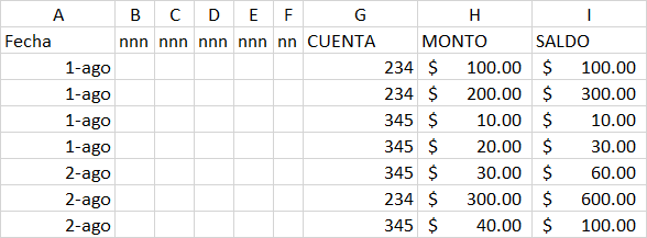 Preciso calcular en la columna i, el saldo acumulativo, pero condicional a la cuenta de la fila en la que se encuentre el dato. Es decir que si en la fila 4 hay un movimiento de la cuenta numero 234 y en la fila 5 uno de la cuenta 345, que en la columna i, aparezca el saldo acumulado con ese movimiento para la cuenta que le corresponde.