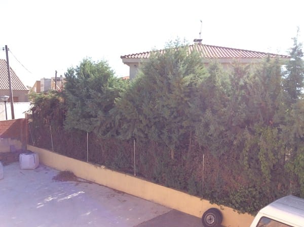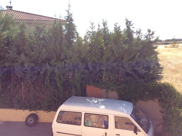 A los días de llegar, llevaron a un chaval para que les limpiara su parcela y podara su lado, así que me acerqué y les pedí que me podaran por mi lado ya que yo no tenia medios ni para cortar ni para subirme tan alto. El chaval vino al día siguiente y termino de llenar el contenedor que tenían, cortándome unos 3 metros lineales de unos 15 en total más o menos. Me dijo que cuando los dueños le pidieran otro contenedor seguía, total, han pasado 3 semanas se han llevado el contenedor y no han traído otro.