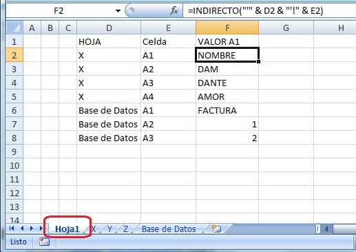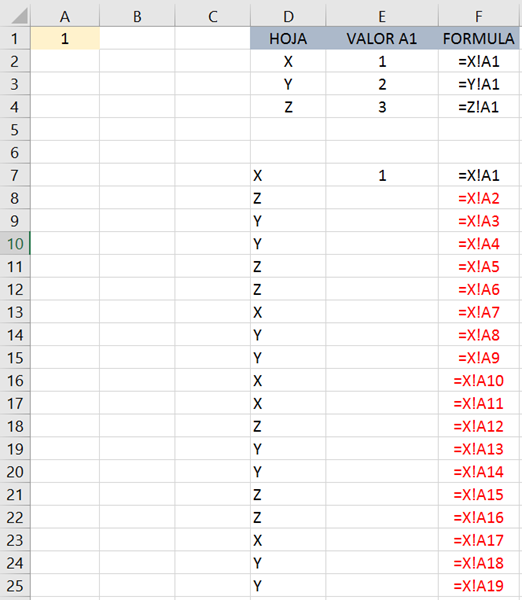 Pero quiero que el nombre de la hoja, se inserte automáticamente, dependiendo del valor contenido en la lista de nombres de las hojas. Si copio la formula, excel me vincula el resultado a la misma hoja, pero la siguiente fila. Y lo que necesito es, la misma fila, de la siguiente hoja. Así que tengo que vincular la fórmula, al nombre de la hoja, según se especifique en la lista de hojas (X, Y, Z).