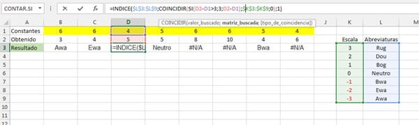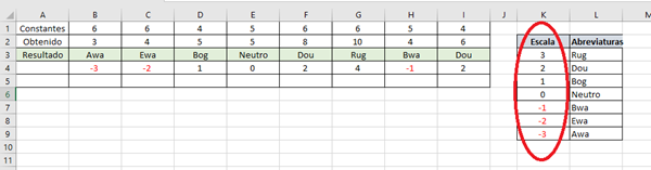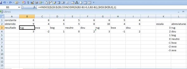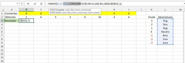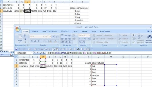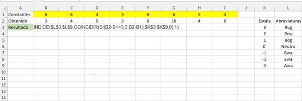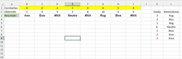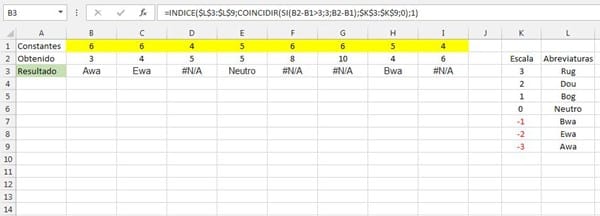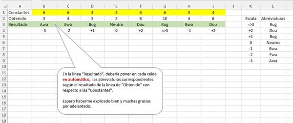 Tengo un problema con Excel que creo que es fácil pero no consigo dar con la formula correcta, espero que me podáis ayudar, os explico como es el problema: En la línea "Resultado", debería poner en cada celda en automático, las abreviaturas correspondientes según el resultado de la línea de "Obtenido" con respecto a las "Constantes".