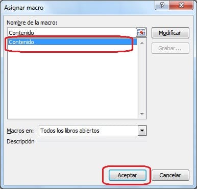 3. En la siguiente ventana, selecciona la macro Contenido y presiona el botón Aceptar.