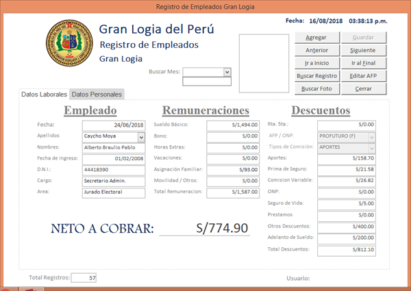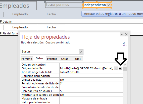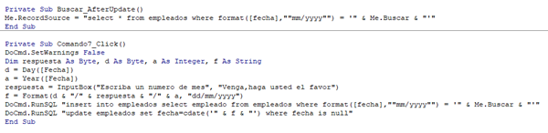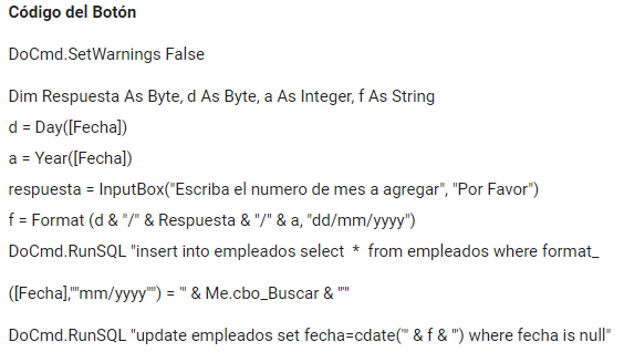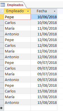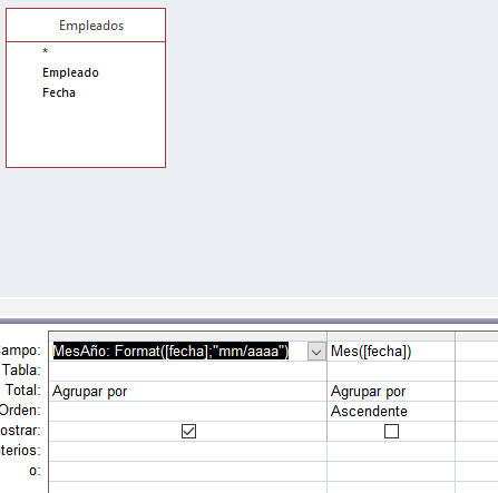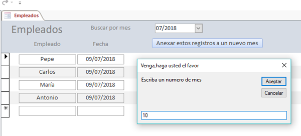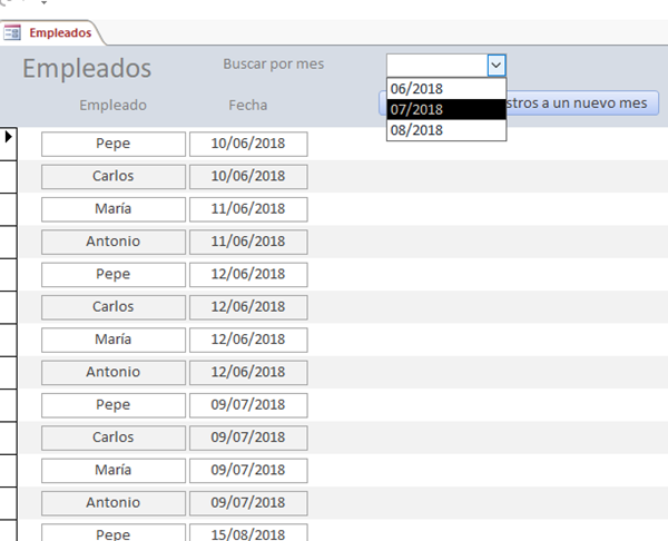 Les escribo nuevamente por aquí con un problema que tengo, la cosa es así, tengo una tabla de empleados la cual tiene su consulta y su formulario y me han pedido que coloque en el formulario para buscar por rango de fechas por meses osea si hago la planilla de junio se me guarda con ese mes ahora le toca a la planilla de julio yo me puedo traer los datos de junio pero sin dañar ese mes osea me traigo los datos de junio como referencia de que nunca cambian pero que se graben para julio para poder modificarlos y grabarlos como julio y así sucesivamente para el mes de agosto ya con la ayuda de Sveinbjorn pude traer los datos desde un cuadro combinado y grabarlos en la tabla por eso no hay problema pero ahora como puedo agruparlo por meses porque hasta cuando se van a imprimir las planillas de pago o las boletas salen todas las que se han grabado en la tabla o consulta y la idea es que me de los 19 empleados por meses, 19 empleados el mes de junio y los mismos 19 en julio y 19 el mes de agosto y así.