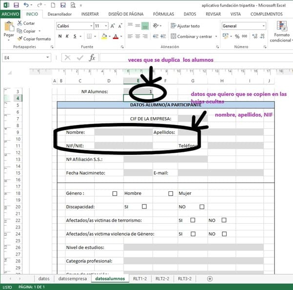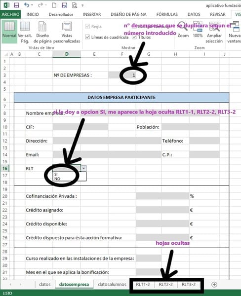 Lo que hago es,(imagen 1) si el numero de empresas le pongo 1, y en la opción RLT= SI solo aparece RLT1-2, si pongo 2 y en RLT=SI aparece RLT2-2 y así sucesivamente, pero puedo ponerle en 2 empresas pero en la RLT de la primera=NO, entonces no me aparecería RLT1-2, pero en la RLT se la segunda le pongo SI y me aparecería RLT2-2, según si le he dicho que SI a la RLT se copien los datos de la segunda imagen u hoja (datosalumnos) a la hoja RLT*-2, solo en esa hoja y serán introducidos mas adelante no cuando de desoculte la hoja (RLT*-2).