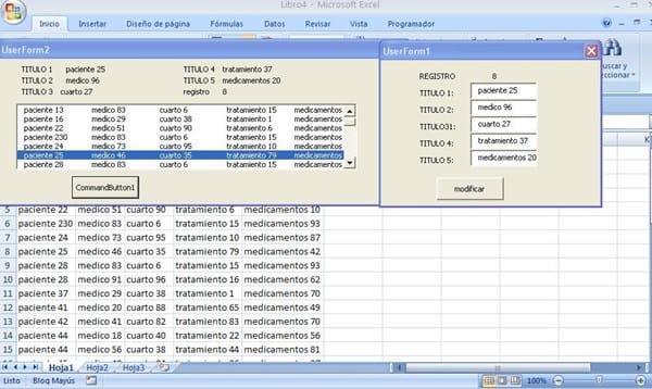 para el formulario modificar Private Sub CommandButton1_Click() Set DATOS = Range("pacientes") dato = TextBox1.Text With DATOS Set RENGLON = .Rows(Label7) End With With RENGLON .Select .Cells(1, 1) = dato .Cells(1, 2) = TextBox2.Text .Cells(1, 3) = TextBox3.Text .Cells(1, 4) = TextBox4.Text .Cells(1, 5) = TextBox5.Text End With Set DATOS = Nothing: Set RENGLON = Nothing End Sub Private Sub UserForm_Activate() With pacientes TextBox1.Text = .Label6 TextBox2.Text = .Label7 TextBox3.Text = .Label8 TextBox4.Text = .Label9 TextBox5.Text = .Label10 Label7 = .Label11 End With End Sub