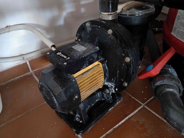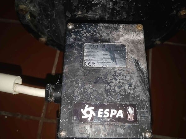 La bomba es una ESPA Flipper 1 75M, que calculo debe tener 15 años, ha estado parada unos 3 años al menos que yo sepa que es el tiempo que compre la vivienda. Esta temporada la puse en marcha. Esta empezando a perder agua por la base (cosa que no hacia al inicio de temporada), no localizo exactamente donde es la fuga, pero si se encharca levemente la zona del motor. Pierde más agua con el motor encendido que parado, pero aun así durante la noche parada empapa un buen trapo.
