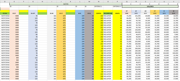 En la tabla de datos la columna E, G, I, J, L y M corresponde a ID únicos y en las columnas N y P hay dos criterios que se deben asociar a cada registro de los ID, para luego sumar los valores de las columnas Q, R, S, T, U y V según la combinación de los IDs con los criterios N y P .Cada ID tiene asignado un valor, es decir el ID EP (Columna E) va con el valor de EP (columna Q), cada registro tiene un centro de costos y grupo.
