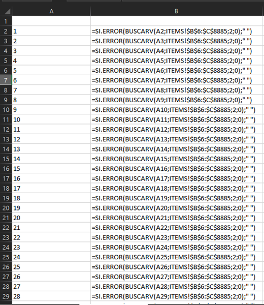 SI.ERROR(BUSCARV(A2;ITEMS!$B$6:$C$8885;2;0);" ")
