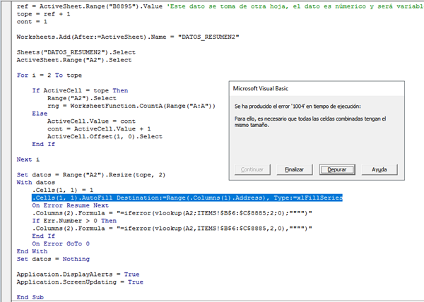 'Declaro variables ref = ActiveSheet.Range("B8895").Value 'Este dato se toma de otra hoja, el dato es númerico y será variable tope = ref + 1 cont = 1 'Creo una nueva hoja y me dirijo a ella Worksheets.Add(After:=ActiveSheet).Name = "DATOS_RESUMEN2" Sheets("DATOS_RESUMEN2").Select ActiveSheet.Range("A2").Select 'Empiezo a hacer una comparacion, donde digo que si la celda activa es igual a la variable tope, entonces que cuente cuantas celdas con datos hay en la columna A, si la celda y la variable son diferentes entonces deberá ir númerando en secuencia: 1, 2, 3, 4 For i = 2 To tope If ActiveCell = tope Then Range("A2").Select rng = WorksheetFunction.CountA(Range("A:A")) ' la idea de saber cuantos datos hay es que a la hora de ingresar la formula, se ingrese en el mismo numero de filas Else 'Aca es donde empiezo a enumerar las filas ActiveCell.Value = cont cont = ActiveCell.Value + 1 ActiveCell.Offset(1, 0).Select End If Next i 'A partir de acá es donde debería pegar la macro que ingrese la formula
