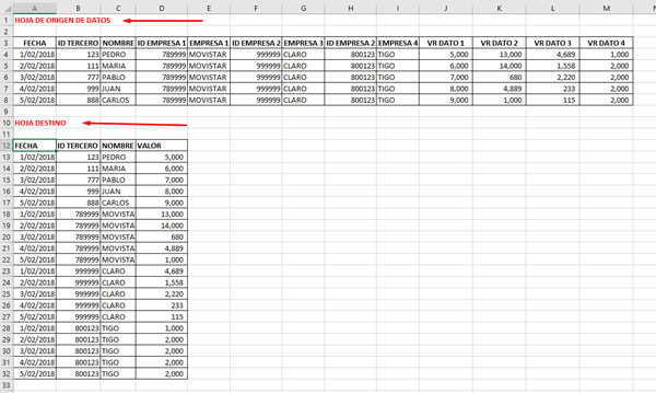 Tengo un libro de excel que tiene varias hojas, de las cuales de una de ellas quiero copiar datos que van de la columna A la columna M, los rangos a copiar son discontinuos y luego pegarlos en otra hoja a partir de la columna A, B, C y DE en el la última fila vacía que encuentre, algo así como la imagen siguiente: