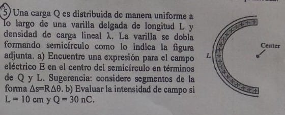 Una carga Q es distribuida de manera uniforme a lo largo de una varilla delgada de longitud L y densidad de carga lineal...