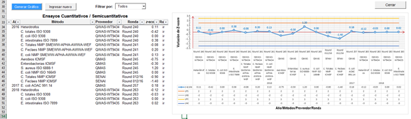 Tengo el siguiente problema que espero puedan orientarme. Tengo una hoja de Excel con datos como los que mostraré más adelante. Cada vez que realizo un filtro mediante el combobox funciona la operación, en este caso filtro muestra resultados: Todos, Cuantitativos y Semi-cuantitativos. Sin embargo, cuando genero la gráfica de lineas para ver mis resultados no logro que pueda verse la gráfica que corresponde a los datos filtrados.