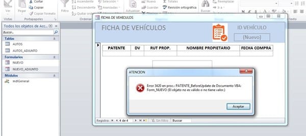 Al intentar hacer el mismo proceso en un formulario llamado NUEVO_ADJUNTO, pero ahora incorporando una imagen adjunta dentro de la base de datos, me produce el siguiente error.