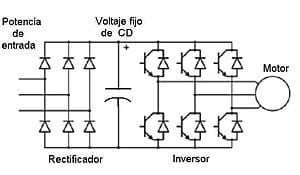El variador, recibe alterna (monofasica o trifasica), la rectivica y filtra transformandola en la tension de continua que se ve en el dibujo inferior, en rojo (el valor de pico). Ese valor de pico, tambien se regula mediante un rectificador controlado a la entrada... pero olvidate de eso, y tomalo como "Valor de corriente continua rectificada y filtrada"