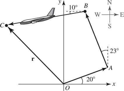 Un avión parte de un aeropuerto ubicado en el origen O y vuela a 150 mi en la dirección 20° noreste a la ciudad A. De A el avión vuela después 200 mi en la dirección 23° noroeste a la ciudad B. De B el avión vuela 240 mi en la dirección 10° suroeste a la ciudad C. Exprese la ubicación de la ciudad C como un vector r igual al que se presenta en la FIG. Determine la distancia de O a C.