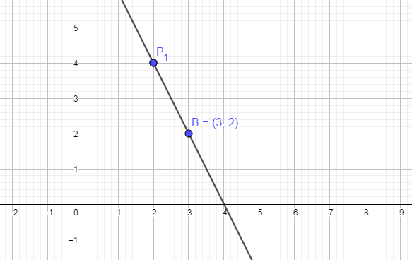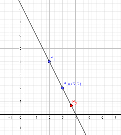 $$\begin{align}&\frac{y-4}{2-4}=\frac{x-2}{3-2}\\&y = -2x+8\end{align}$$Vemos que entre P1 y el punto B, la relación es 3 y que entre B y P2 hay 2, así que en el eje 'X' la diferencia entre P1 y B la partimos entre 3 (lo que da un tercio) y luego la multiplicamos por 2 (lo que da 2/3).