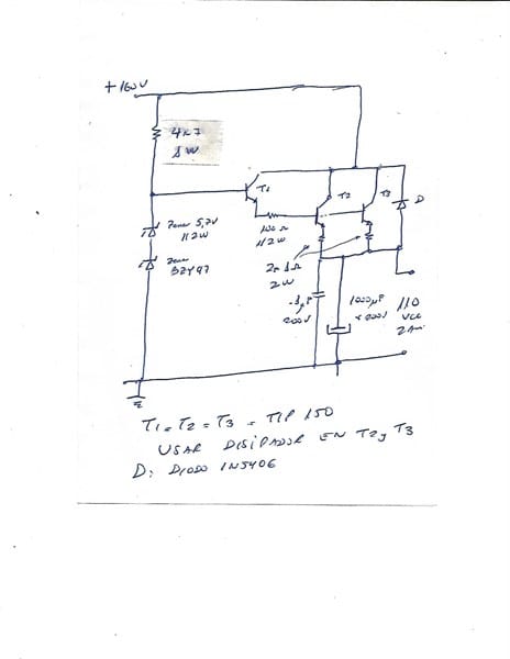 Los componentes son todos bastante comunes, un poco mas raro es el zener de 110 voltios, pero figura en listados a un precio de medio euro. La fuente de 160 volt, no la dibujo, porque supongo que la tienes: Y el electrolitico de esa fuente deberia ser de al menos 2200 micros para no tener problemas de ripple.