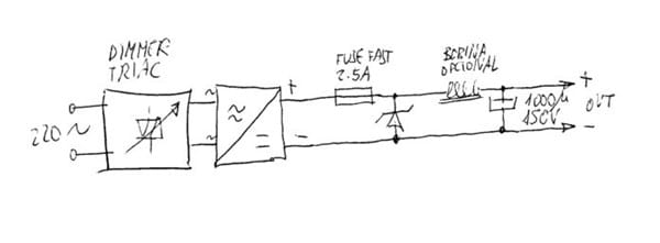 Y el capacitor electrolitico... 200 voltios para que soporte bien la tension, con margen: Y su capacidad, lo mas grande posible: minimo esos 1000 micros y si puedes ponerde 2000 o mas, todavia mejor. El tema es que esos capacitores en alta tension, suelen ser caros.