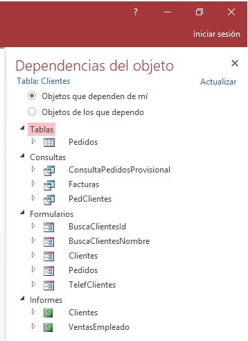 Como puedes observar también puedes ver los Objetos de los que depende esa Tabla o una consulta o un Formulario que señales. Un saludo >> Jacinto