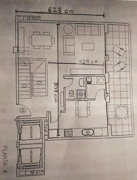 He adquirido recientemente un piso y querría realizar unas obras para disponer de una distribución abierta del salón, comedor y cocina. Se trata de un espacio rectangular de 808 cm por 623 cm de los cuales el espacio dedicado a este fin seria de 808 cm por 429 cm ya que el resto esta destinado a las escaleras de subida y bajada a diferentes plantas.