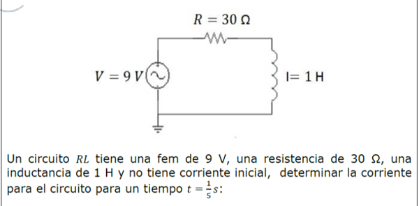 Un circuito RL tien una fem de 9 v una resistencia de 30 Ω una inductancia de 1 H y no tiene corriente inicial determinar la corriente para el circuito para un tiempo t=(1/s) s: