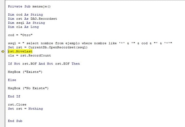 ssql = " select nombre from ejemplo where nombre like '*' & '" & cod & "' & '*'"
