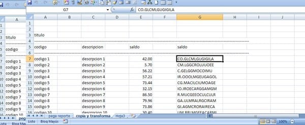 Necesito que la información de código y descripción de productos se copie en otra pestaña y en esta hoja de resultados reemplazar la columna de stock que tiene números (que pueden tener decimales), reemplazar por determinadas letras, generando códigos alfabéticos representativos de valores: