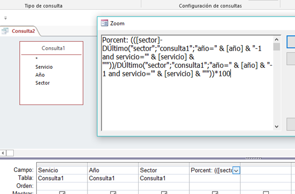 Tengo una consulta que me dice el número de clientes que tengo por años. Le he puesto como criterio un rango de fecha y funciona bien. A partir de esta misma consulta hice un informe donde al ejecutarlo me funciona bien pues me dice el número de clientes dentro del rango de tiempo que le pido. El problema está en que debo calcular el crecimiento de mis clientes a través de una fórmula y no sé como plantearla, pues en la vista diseño del informe no se muestran los dos campos como cuando se ejecuta el informe, por tanto no tengo dos campos para hacer mi fórmula.
