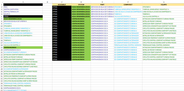 Tengo una lista vertical(columna A) como se observa en la imagen y lo quiero poner en forma horizontal, la columna C se repite según la columna D, esta según la columna E y esta según la F, la única columna que no se repite es la G.