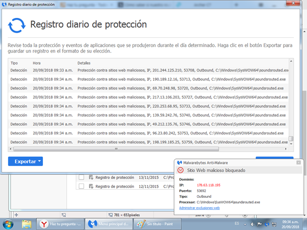 Me parecio extraño este hecho, por lo cual al intentar cerrar Word (ojo, que era un PDF, que se abrio "solito", con un programa distinto al que deberia), el malwarebytes, que tengo instalado, comenzo a emitir alertas de bloqueos a "SITIO WEB MALICIOSO BLOQUEADO", todos los sitios se intentan conectar atravez del proceso c:\windows\SYSWOW64\soundsrouted.exe