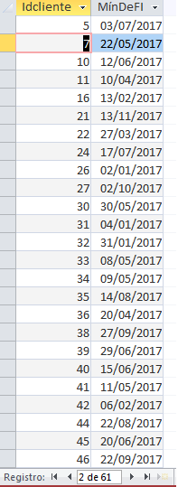 Tengo una consulta con dos campos: Id Clientes y Mínimo de fecha. Quiero sumar el total de registros IdClientes para cada año. Cada vez que lo intento a través de Suma de totales, ya sea aplicando SUMA o CUENTA me sale en blanco la consulta. Necesito que la consulta me diga: