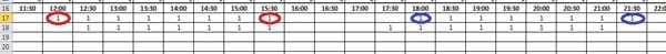 Buenas tardes, su ayuda por favor ya que necesito hallar 4 datos según este cuadro. He usado BUSCARH pero solo me da dos (12:00 y 21:00) es decir los extremos en la primera fila, ¿mi consulta es que formula puedo usar en este caso?