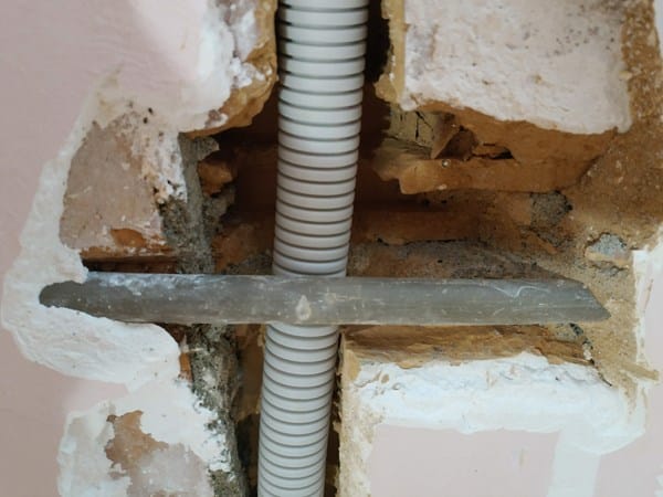 Estoy intentando hacer una roza horizontal de tan solo 30 cm y cuál ha sido mi sorpresa cuando me he topado con un tubo vertical estrecho de plástico. Imagino que se trata de un circuito eléctrico independiente al que intento seguir pero al no tener experiencia no sé qué debería hacer a continuación: ¿Abro más el ladrillo y pongo los cables y el tubo corrugado por debajo o qué otra opción tengo?