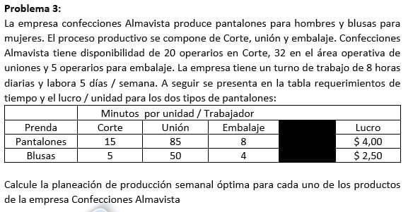 La empresa confecciones Almavista produce pantalones para hombres y blusas para mujeres. El proceso productivo se compone de Corte, unión y embalaje. Confecciones Almavista tiene disponibilidad de 20 operarios en Corte, 32 en el área operativa de uniones y 5 operarios para embalaje.