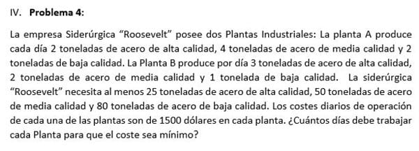 La empresa Siderúrgica “Roosevelt” posee dos Plantas Industriales: La planta A produce cada día 2 toneladas de acero de alta calidad, 4 toneladas de acero de media calidad y 2 toneladas de baja calidad.