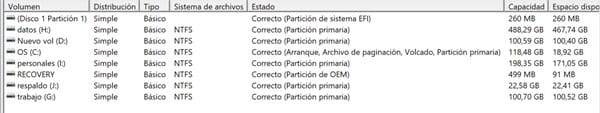 Disco duro de 1 terabyte con windows 10 particionado en C, DE, E, G, H, I, J. El SO está en la partición C con 125 gigas