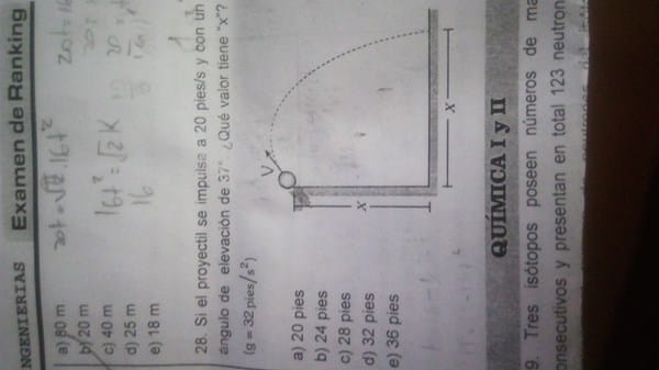 Si el proyectil se impulsa con 20 pies/s y con un angulo de elevacion de 37 grados ¿qué valor tiene x? (g= 32 pies/s^2)