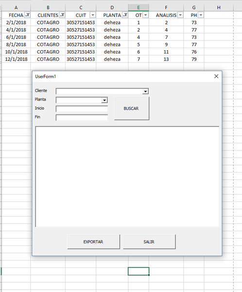 Les hago una consulta, tengo un formulario que utilizo para filtrar una tabla de excel con 4 condiciones (cliente - planta - fecha inicio - fecha final). Todo eso funciona perfectamente.